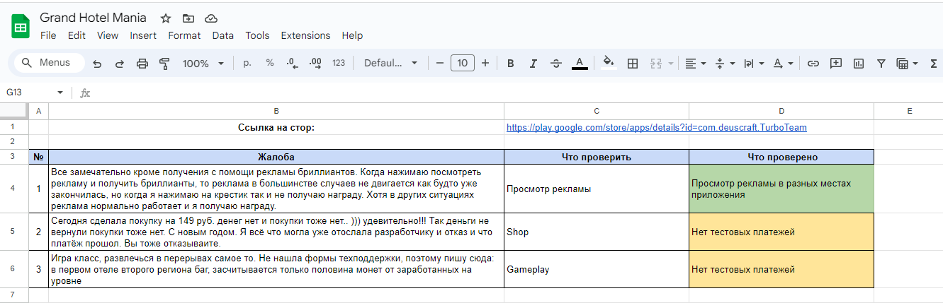 После того, как подобного рода отзывы будут выписаны в соответствующую таблицу, баги необходимо воспроизвести.