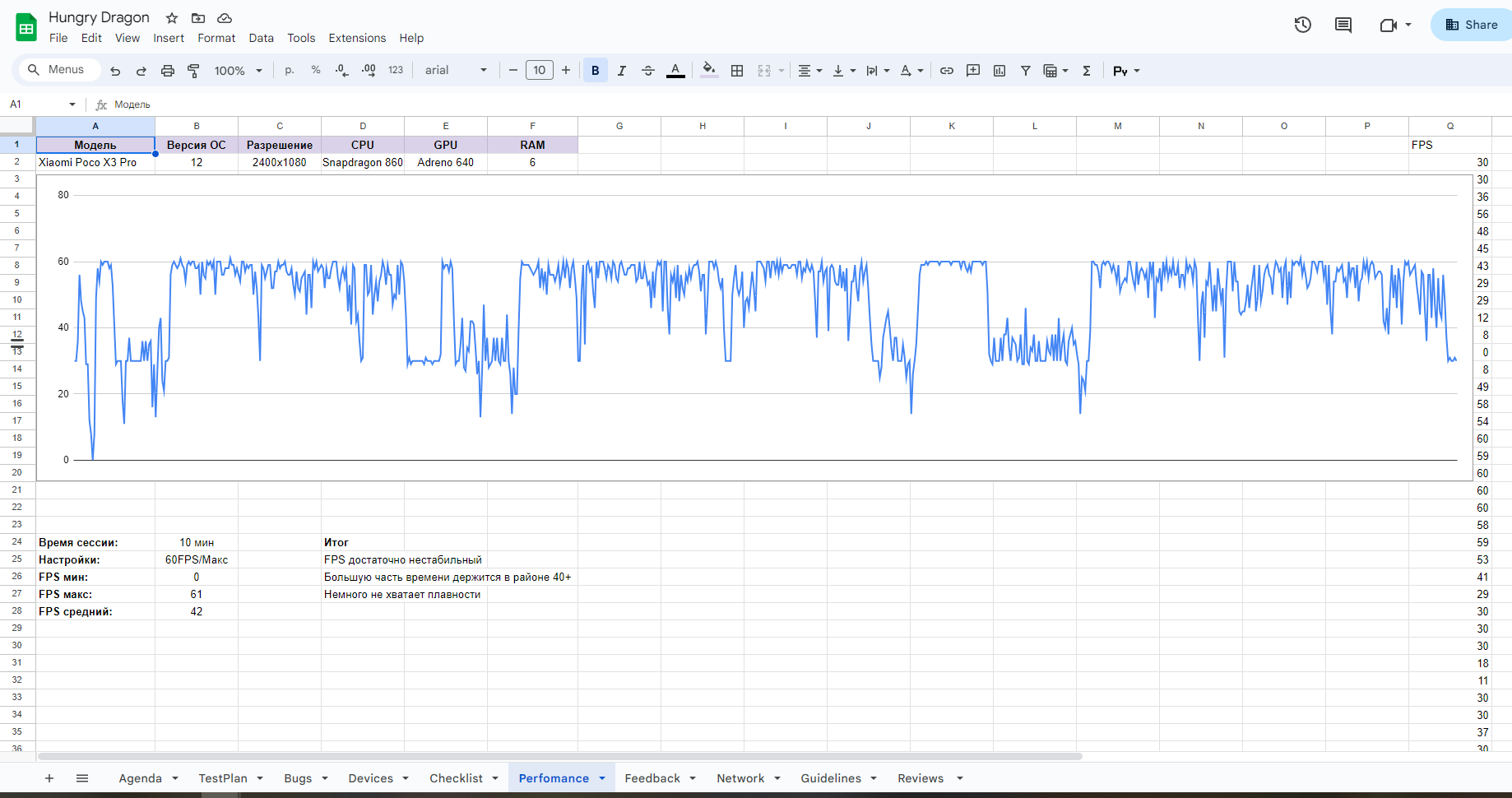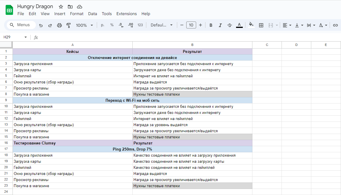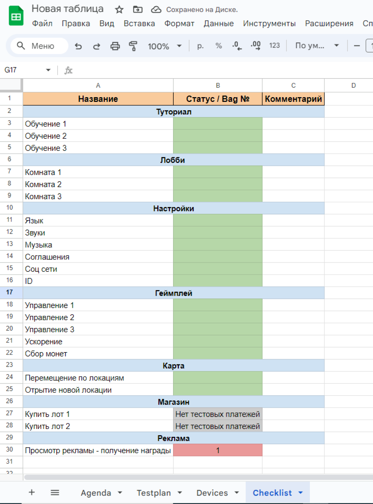 После составления чеклиста тестировщик начинает проверку, придерживаясь данного списка. Если по каким-то причинам пункт не может быть выполнен, в комментариях нужно указать причину (требуется долгое прохождение, нужны читы, не подключены тестовые платежи и т.д.). В случае удачной проверки, напротив каждого пункта отмечают статусы (“passed”, “failed”, “blocked”, “skipped”), либо соответствующий цвет (где “зеленый” - выполнена успешная проверка, а “розовый” - проверка была провалена). Для удобства можно отметить номер бага, который будет расшифрован в разделе Bugs.