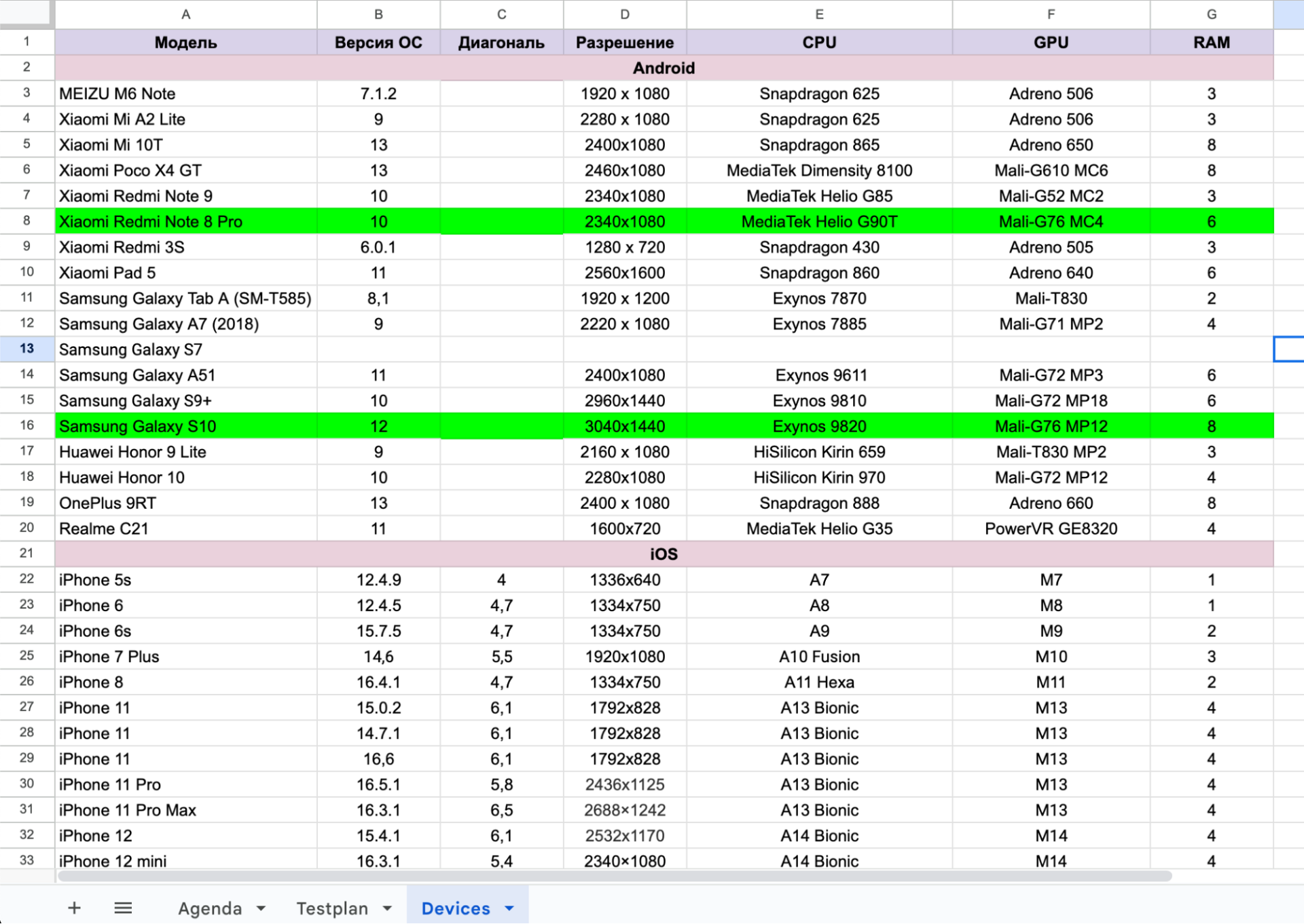 Это могут быть планшеты, смартфоны, отличающиеся характеристиками, версиями, прошивками, разрешениями экрана, диагональю, ОС. Чем обширнее будет список отличительных особенностей выбранных девайсов, тем глубже будет проведено тестирование приложения.